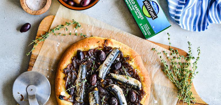 Are you a fan of sardines? I’ve teamed up with Wild Planet Foods to bring you a simple recipe with ingredients from your pantry, that comes together in no time, and it’s packed with flavors and nutrition. I was inspired by the classic French Pissaladière dish to make this pizza with sardines. It is so delicious and perfect for any weeknight meals or lazy weekends. A few tips, you can prepare the caramelized onions ahead of time, and other types of crust works just fine. Just next time you shop, grab a few cans of Wild Planet sardines dipped in extra virgin olive oil. Sustainably caught and firm in texture, these sardines are very easy to include on your menu while gaining essential nutrients such as EPA and DHA Omega-3s, iron, and potassium. Enjoy my recipe!